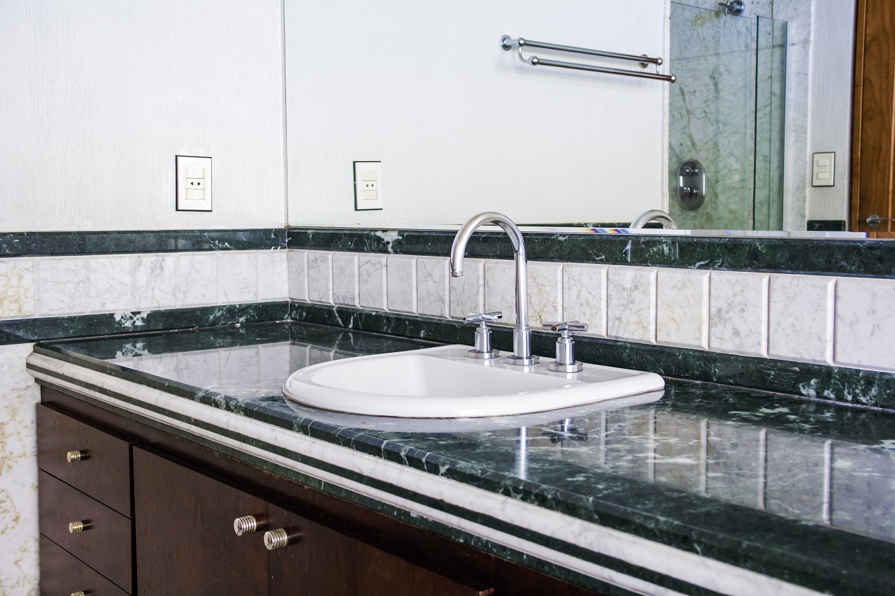- Banho Suíte Casal – Parede, Piso e Lavatório em Mármore e Granito Verde